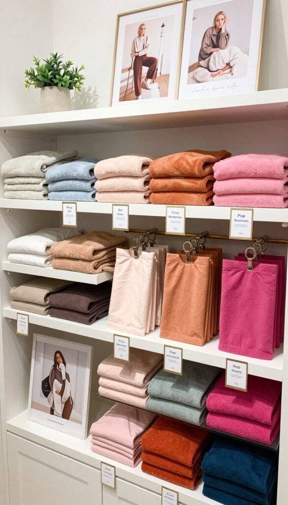 Arrange by color like a mini boutique. It’s instant eye candy and helps shoppers visualize sets.