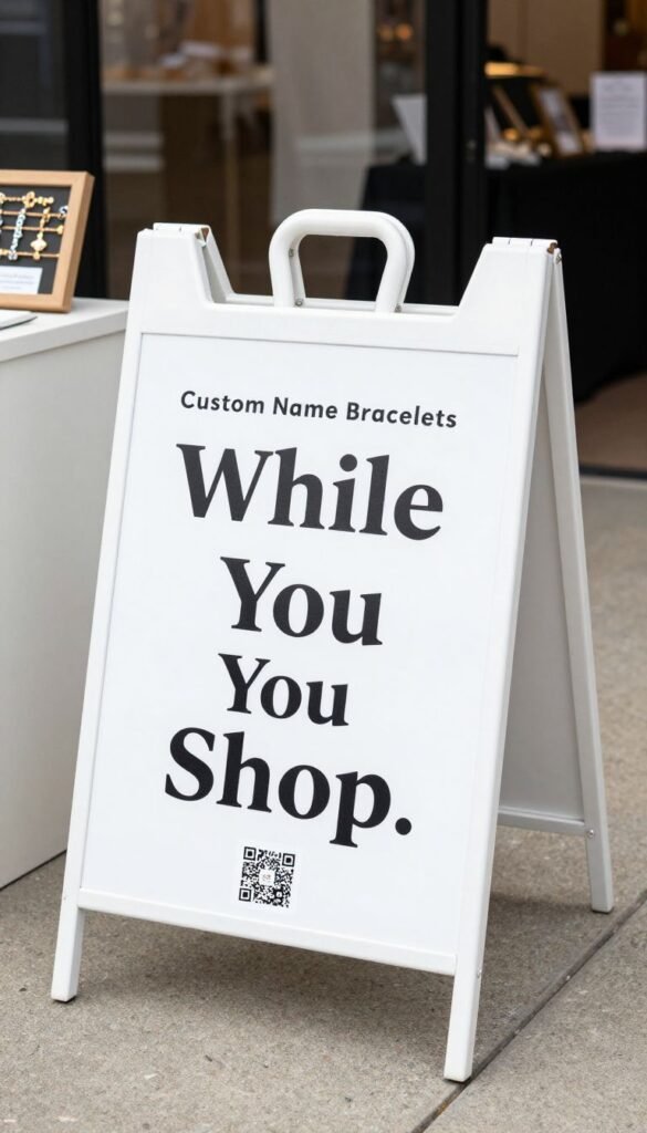 Hook them before they hit your booth. An A-frame outside your space teases deals, new drops, or custom options.