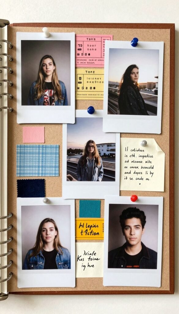 - Print photos, cut magazine bits, add ticket stubs or fabric swatches.