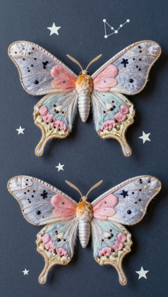 Dreamy moth wings with petal details and dotty constellations. Quietly magical.