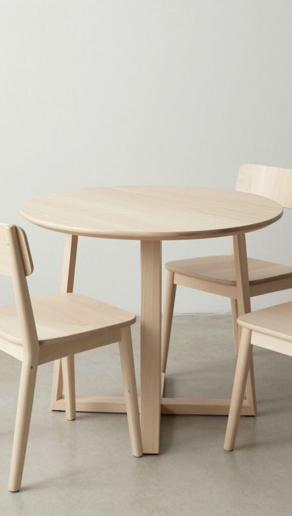 Think pale wood tones and simple geometry. This set nails the airy look with a round table and two clean-lined chairs.