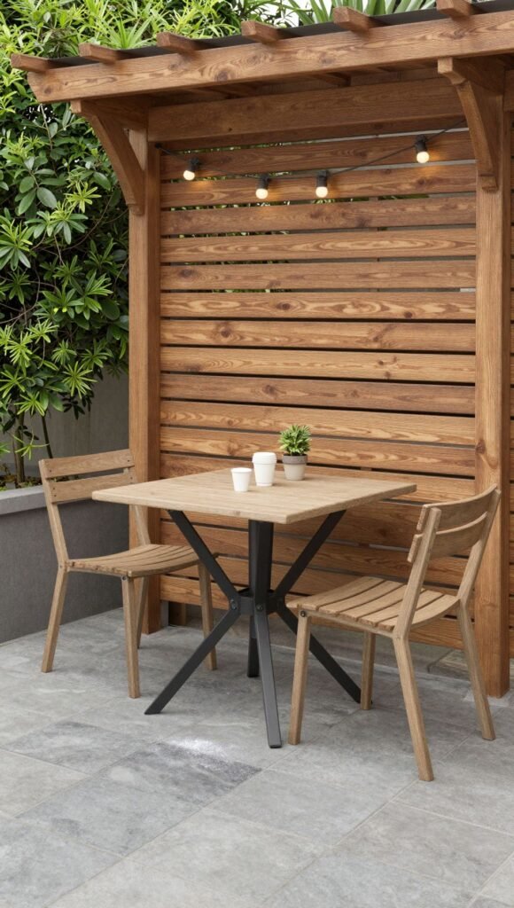 Take the party outdoors, minus the bugs. A bistro table, two chairs, and a pergola wall create an instant patio.