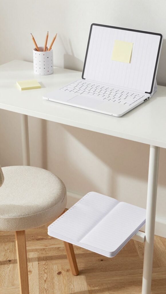 Productivity, but make it adorable. A slim desk, stool, and foldable paper laptop set the scene.