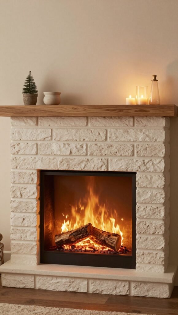 - Key details: Layered hearth, faux logs, mantel shelf.