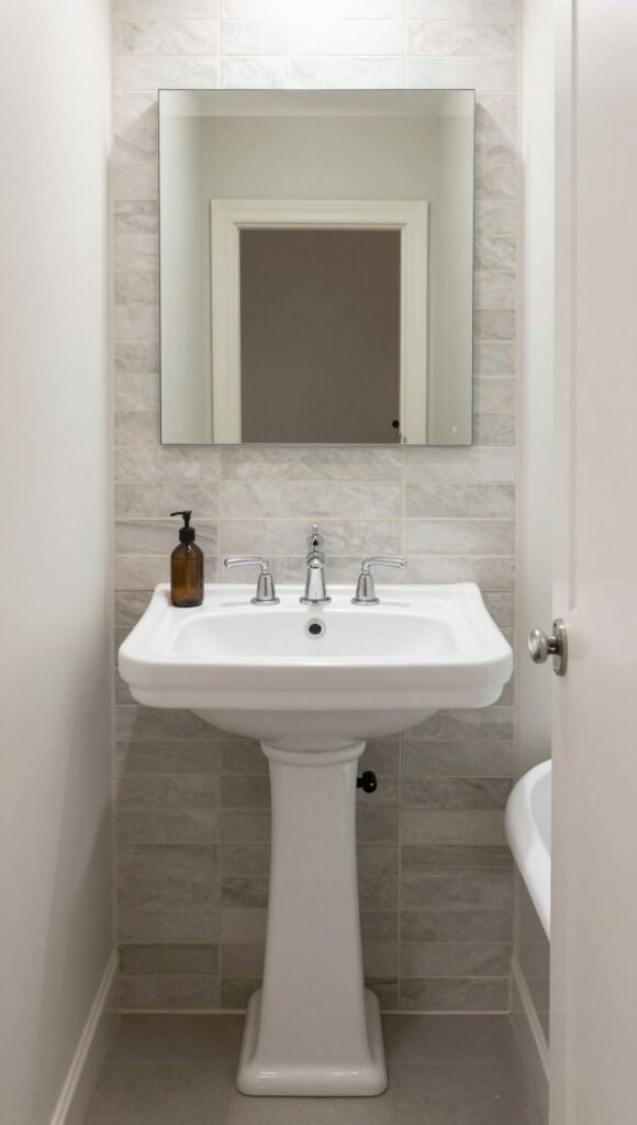 - Key details: Tile backsplash pattern, faucet highlights, clawfoot overlays.